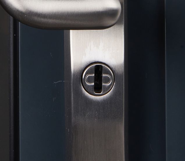 Integrated cylinder guard, visible within the raised backplate, combined with an anti-drill disc which spins if attacked, provides complete cylinder protection.